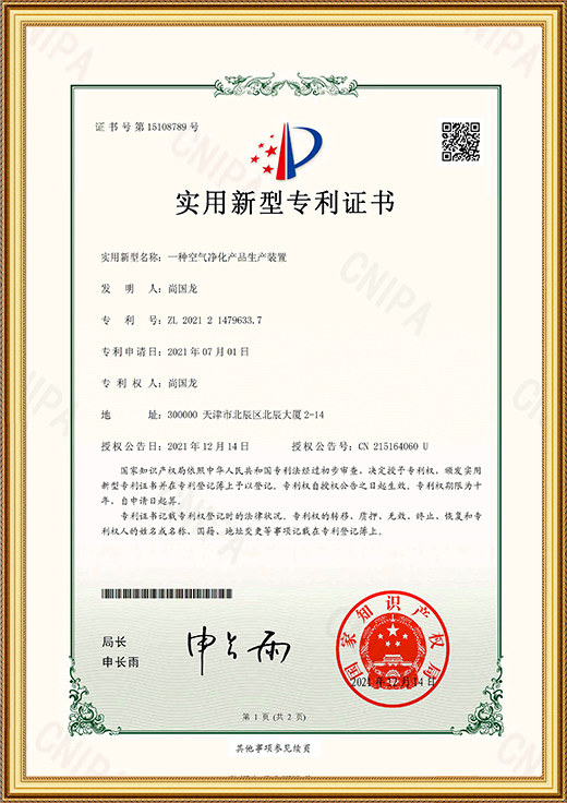• 實用新型專利證書(一種空氣凈化產品生產裝置